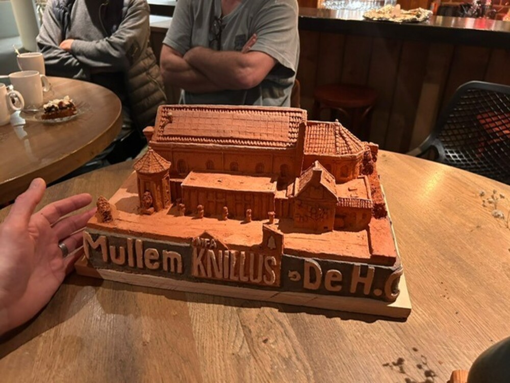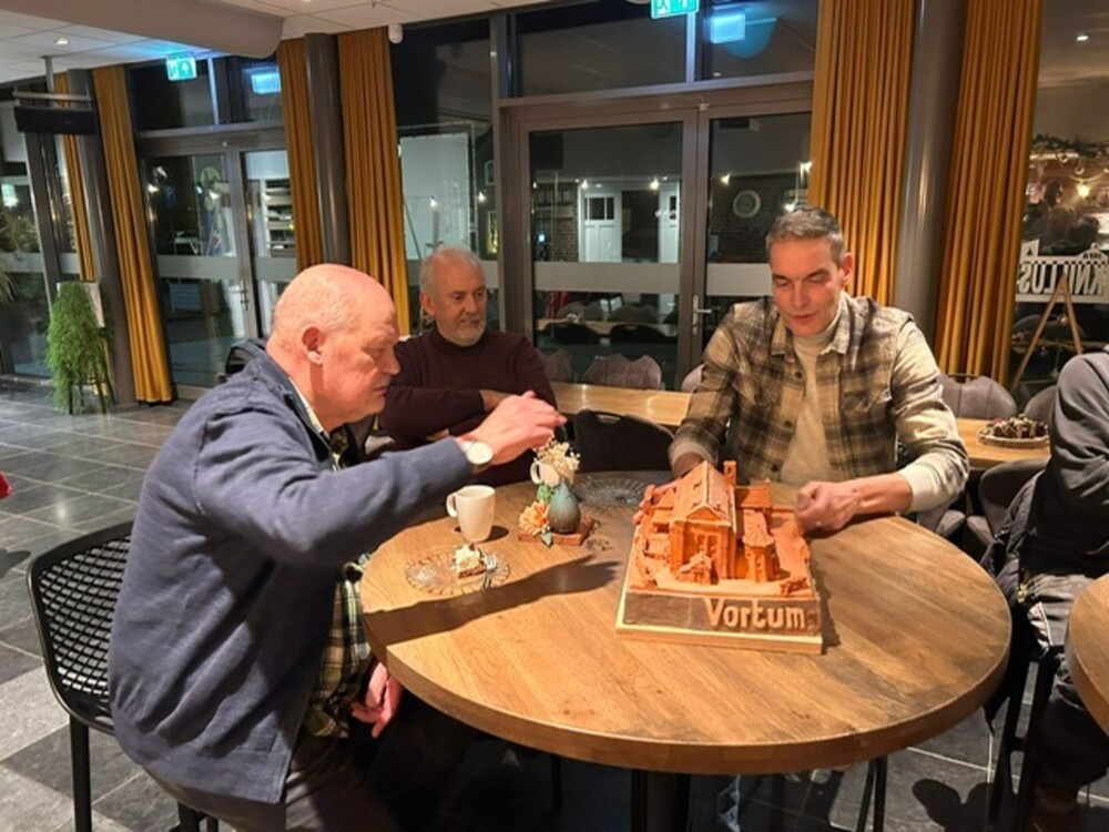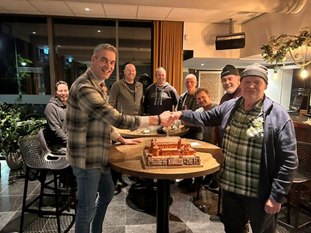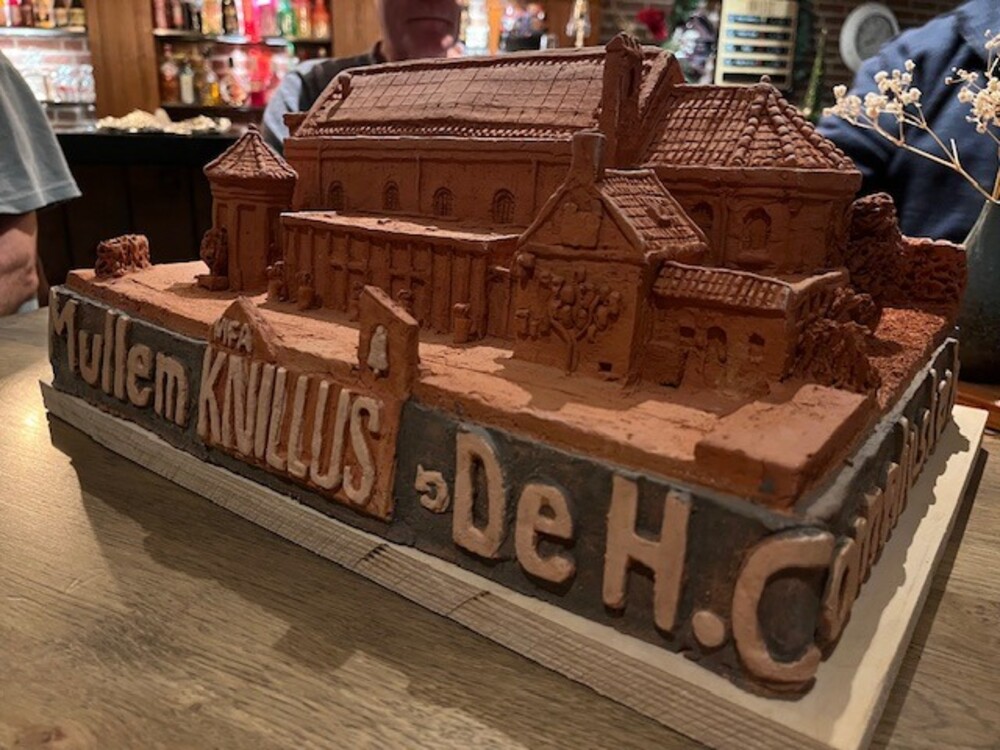 Woensdag 10 december was een bijzondere dag voor MFA KNILLUS. Piet Arts uit Ottersum kwam toen op bezoek in KNILLUS om zijn maquette te overhandigen. Via een netwerkcontact werd bij toeval ontdekt dat hobby-kunstenaar Piet Arts inmiddels meer dan 30 kerken uit de wijde omgeving heeft nagemaakt met klei. Zo ook de voormalige Sint Corneliuskerk in ons dorp. En....primeur.....ons MFA is het eerste MFA dat door Piet is gemaakt! Onder het genot van een stukje taart van mevrouw Wolters én in bijzijn van het KNILLUS KLUS TEAM is de maquette in ontvangst genomen en heeft deze een mooi plekje in de kroeg gekregen.